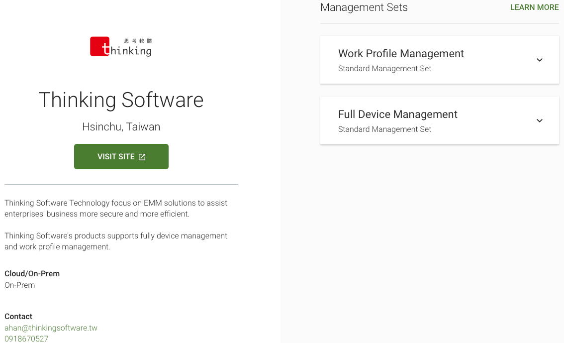 Thinking UEM 支援 Android Enterprise,並可由 Google 的 Enterprise Solution Directory 網站中查詢得到: